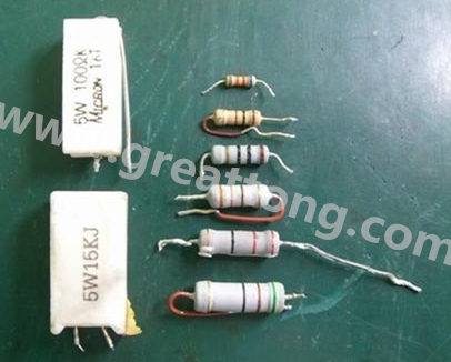 圖片中左方為大功率水泥電阻,可承受較大功率超額,右方則為一般常見的電阻,其上的色碼標示出其阻值及誤差。